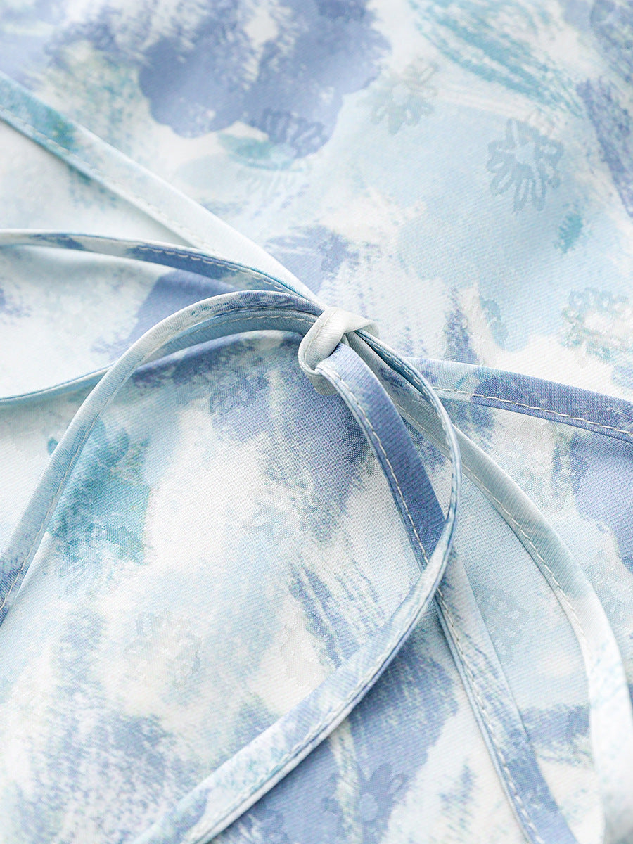 Elegant Floral Print High Waist Midi Dress Spring Fashionable French Style Bubble Sleeve V-neck Dress for Women in Shenzhen