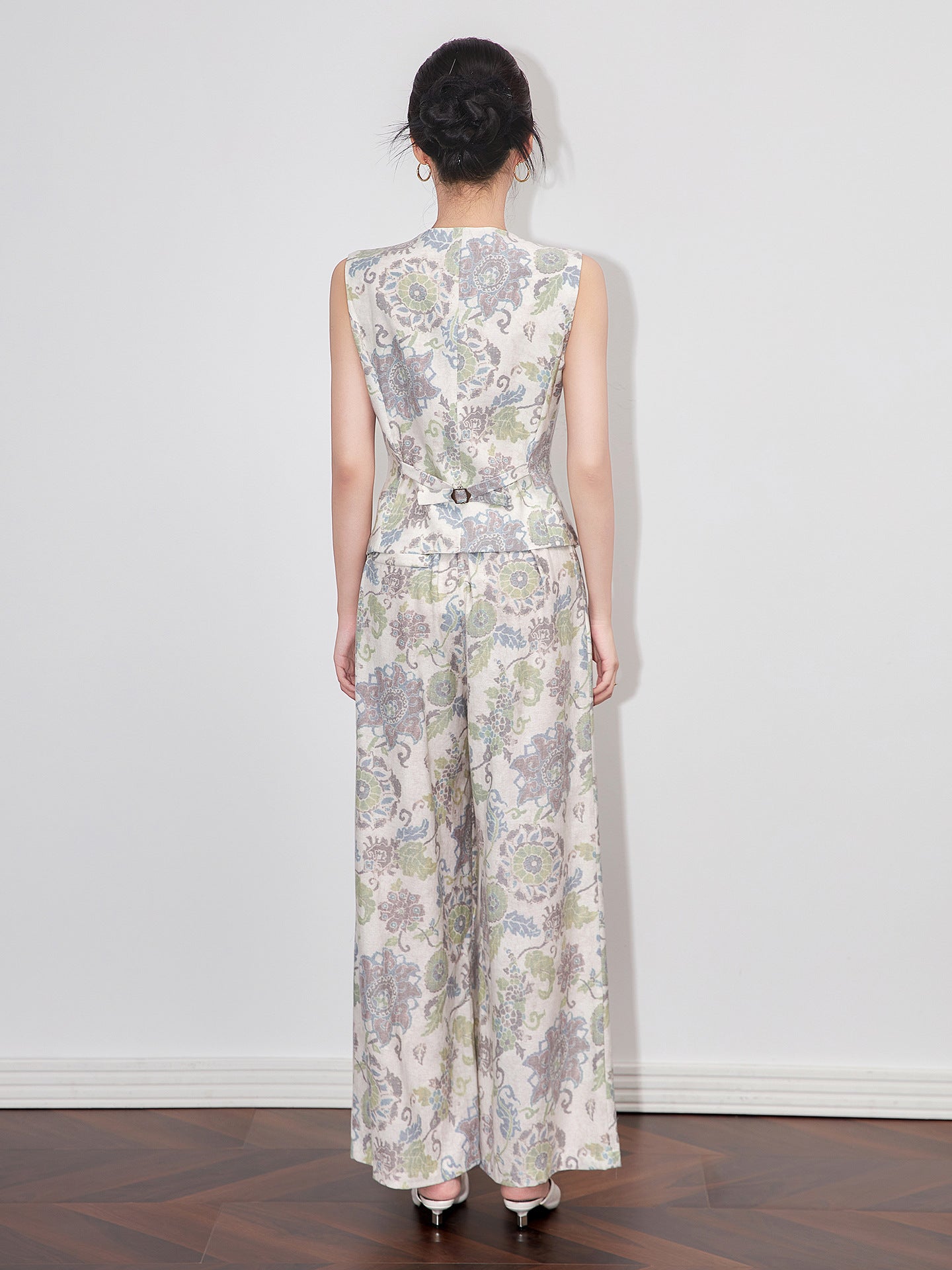 Elegant Lady Summer Print Linen Vest And Pant Sets Two Pieces Womens Outfit Vintage Trousers Suit