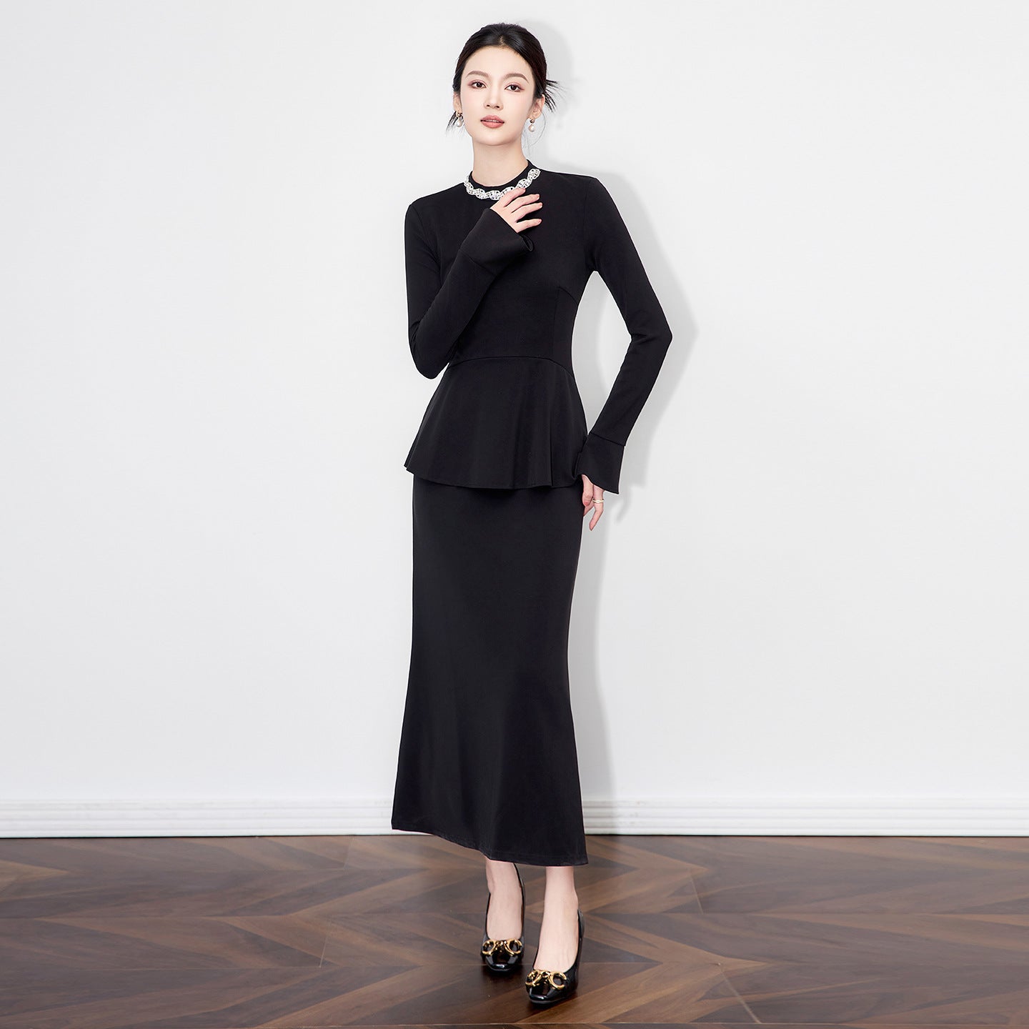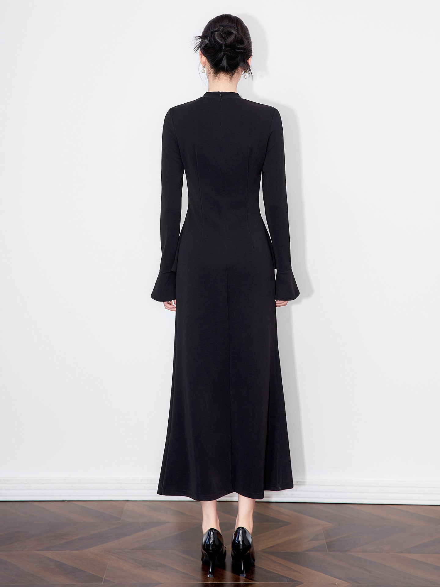 Elegant Short Green Crepe Evening Dresses with Ruffles Sheath Long Sleeve O-Neck Tea Length Prom Dresses for Women