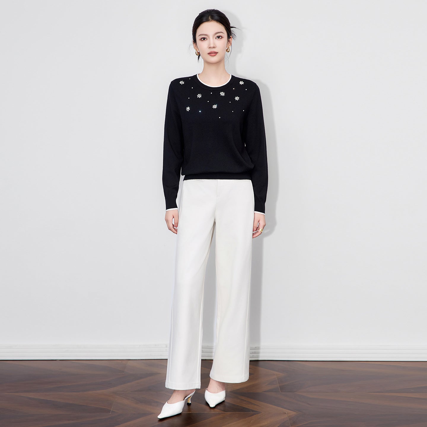 Summer New Women's Long Sleeve Flower Decoration Slim Fit Retro Top